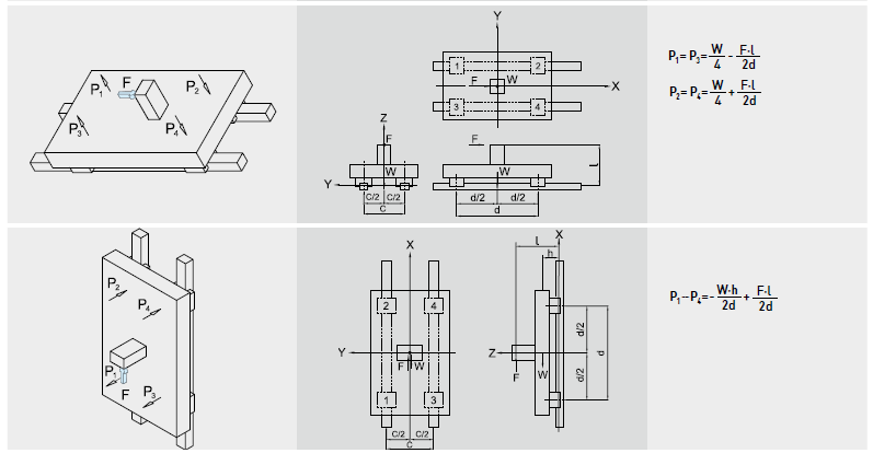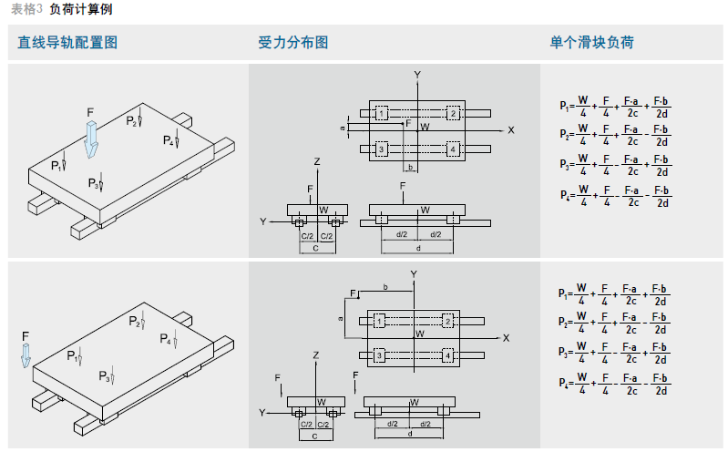 工作負荷的計算方式會隨實際受力分布的情形而產生變化,例如承載物體本身重心的位置、施力的位置,以及運行時起動、停止的加速度慣性力等皆對負荷的計算發生影響,因此使用直線導軌時必須仔細考慮各種負荷狀況,以計算出最正確的負荷值。