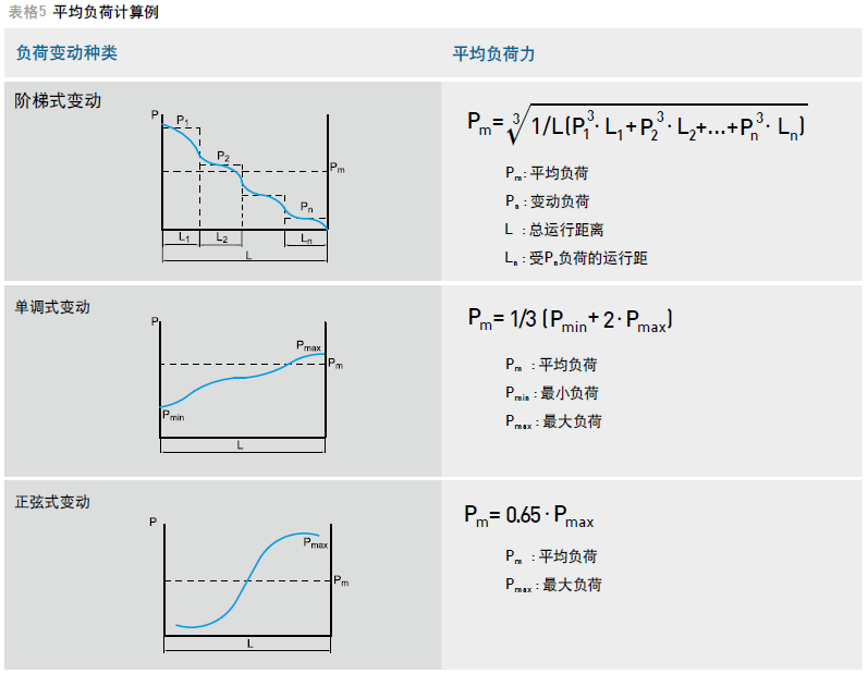在運行中滑塊承受的負荷有時并不是均等的,比方搬送裝置的運行,其前進時額外承受貨物的重量,退回時則只承受裝置本身的重量,負荷呈現階梯式變化,因此必須求出運行中的平均負荷以計算壽命。平均負荷的定義是與負荷變動條件下壽命相等的等效負荷值。