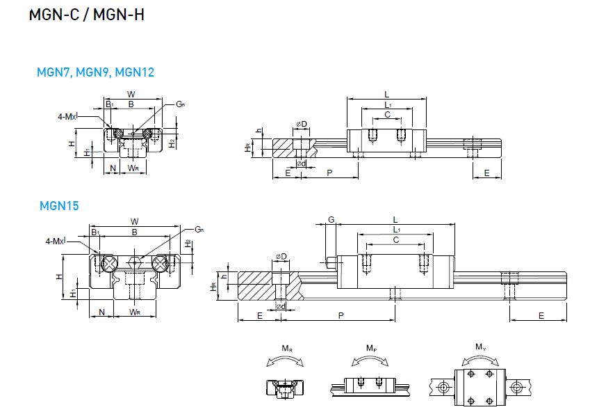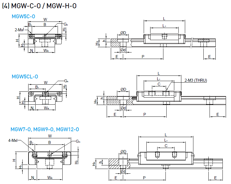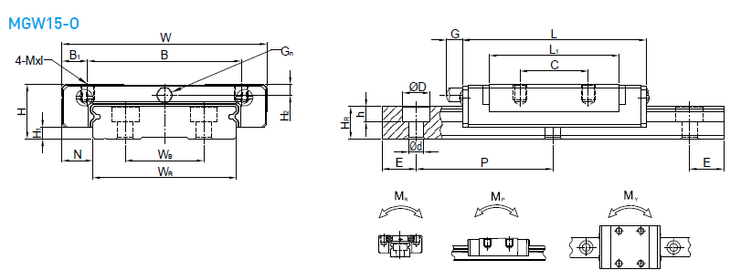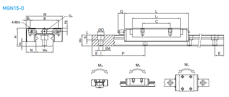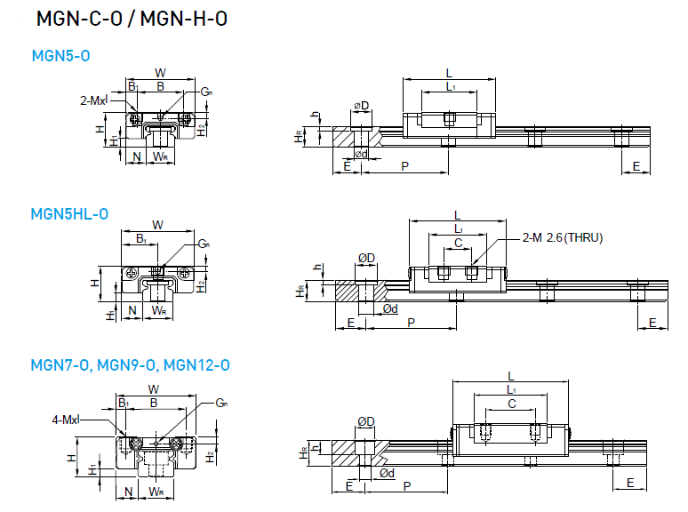 MGN-O中,它同樣具體體積小、輕量化,滑塊主體的一部分采用了樹脂材料,重量減少約20%,特別適合小型化設備使用。不銹鋼材質之線性滑軌,包含滑塊、滑軌及其它金屬配件如鋼珠、保持器等,皆使用不銹鋼材質,具備防銹的特性。采用哥德型四點接觸設計,可承受各方向負荷,具備剛性強,精度高等特性。有鋼珠保持器設計,在精度允許下具備互換性。