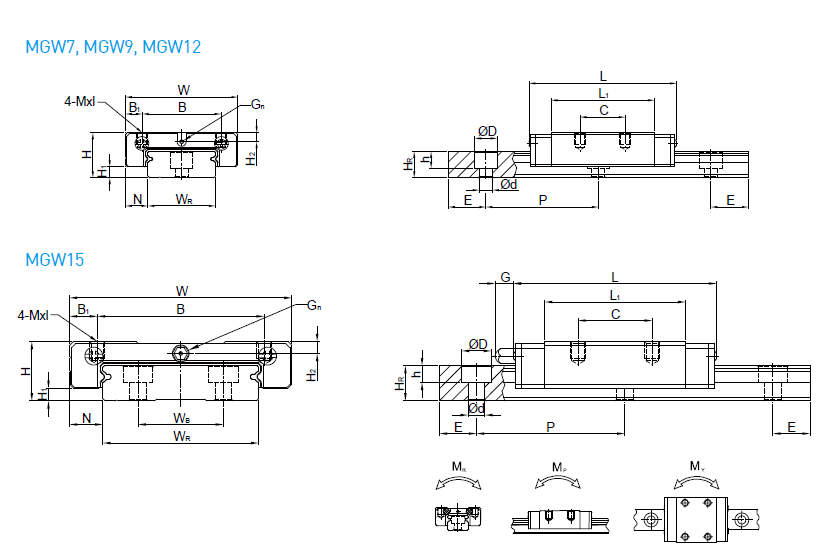 MGW(寬幅)系列則是加寬滑軌之設計大幅提升力矩負荷能力,可單軸使用。 哥德型四點接觸設計,可承受各種方向之負荷并具有高剛性之特點。 滑塊裝有微小型保持鋼絲,取下滑塊鋼珠也不會脫落。