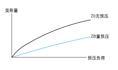 預壓力是預先給與鋼珠負荷力,亦即加大鋼珠直徑,利用鋼珠與珠道之間負向間隙給與預壓,此舉能提高直線導軌的剛性及消除間隙;以右圖來解釋,提高預壓力可增加直線導軌剛性。但小規格建議選用輕預壓以下預壓,以避免因預壓選用過重降低其使用壽命。