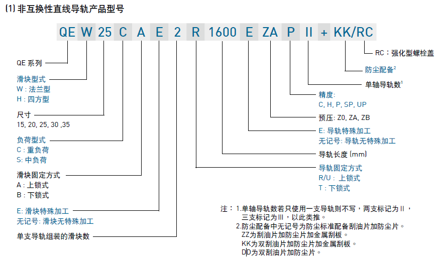 注: 1.單軸導軌數若只使用一支導軌則不寫,兩支標記為Ⅱ,三支標記為Ⅲ,以此類推。