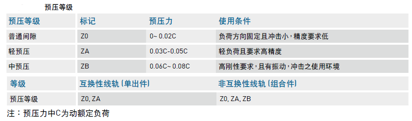 QE 系列直線導軌提供三種標準預壓,可依據用途選擇適當預壓力。