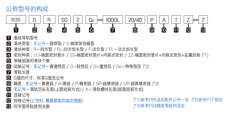 精度 : 無記號(hào)-普通級(jí) / H-高級(jí) / P-精密級(jí) / SP-超精密級(jí) / UP-超高精密級(jí) (*3)